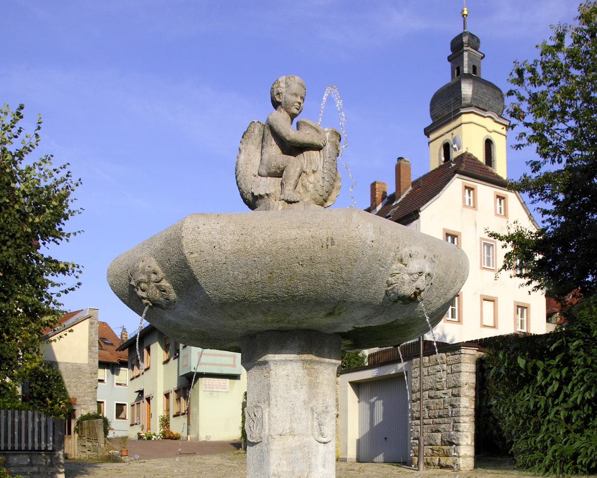Nicht zu übersehen sind auch die denkmalgeschützte Pfarrkirche St. Bartholomäus, mit ihrem weithin sichtbaren Kirchturm, sowie der als Wahrzeichen des Ortes geltende rund 30 Meter hohe Wasserturm mit seinen 154 Stufen. In der Pfarrkirche ist unter anderem das Gemälde „Petrus in der Reue“ aus der Schule des Würzburger Hofmalers Konrad Onghers (1659-1706) zu sehen. Im Außenbereich der Katholischen Pfarrkirche befindet sich ein Sandstein-Bildstock mit barockem Kopfteil. Dieses zeigt auf der Vorderseite vermutlich eine Darstellung der Beschneidung Christi und auf der Rückseite Figuren des Hl. Sebastian, des Hl. Kilian und der Hl. Barbara, beidseits flankiert von zwei Engelsköpfen.
